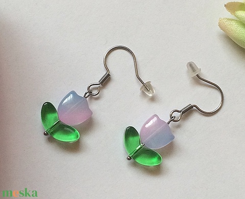 Kék-rózsaszín átmenetes tulipán fülbevaló zöld levélkével