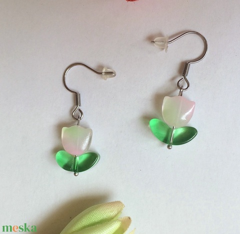 Zöld- rózsaszín színátmenetes tulipán fülbevaló zöld levélkével