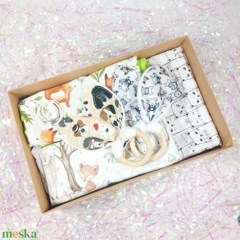 Ajándékszettjeink tökéletes ajándékok babaváró buli, első babalátogatásra... Minden szett 6 db terméket tartalmaz. 5500 Ft A képen látható szett tartalma: 1 db textilpelus 2 db szundikendő 2 db nyuszifül rágóka 1 db nyaklánc (anyukának)