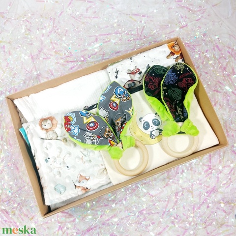 Ajándékszettjeink tökéletes ajándékok babaváró buli, első babalátogatásra... Minden szett 6 db terméket tartalmaz. 5500 Ft A képen látható szett tartalma: 1 db textilpelus 2 db szundikendő 2 db nyuszifül rágóka 1 db neszesszer
