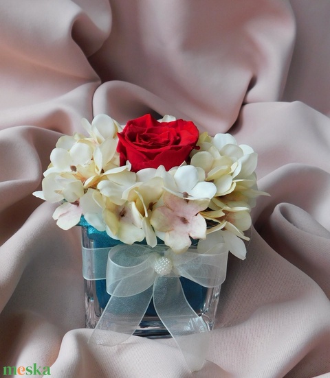 - Anyaga: tartósítottvirág, organza, üveg, selyemvirág
