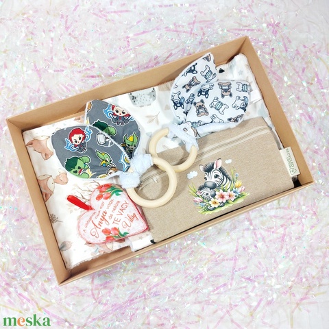 játék & sport, babalátogató ajándékcsomag, rágóka, pelus, szundikendő, neszesszer, filcdísz, unisex, fiús