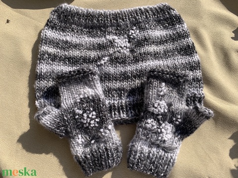 Kesztyű+Körsál, kézikötésű Szürke melírozott nagyon puha szett hímzett fehér virágokkal eladó
