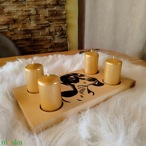 Fából készült asztali gyertyatartó tacskó kutyussal