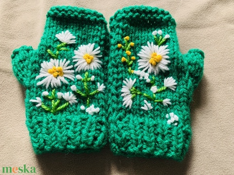 Kesztyű Kézi kötésű Smaragd zöld ujjatlan kesztyű hímzett fehér virágokkal eladó.