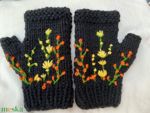 Kesztyű Fekete kézi kötésű pamut ujjatlan kesztyű hímzett színes virágokkal eladó.