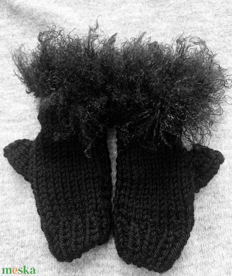 Kötött Kesztyű. kézi Kötésű fekete ujjatlan női kesztyű hosszú szőrös fonallal díszítve eladó