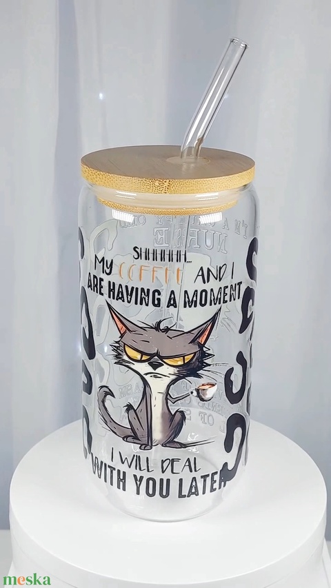 Üveg, szívószálas pohár, bambusztetővel