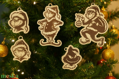 Grincs Karácsonyfadísz Szett (5 db) – Fa, Gravírozott Díszek