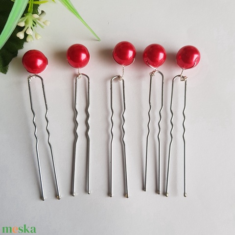Piros gyöngyös menyasszonyi hajtű, drótos hajdísz
