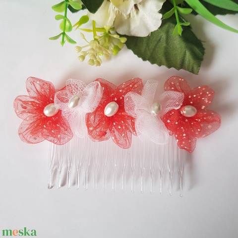 Gyöngyös, piros-hófehér színű tüll virágos hajfésű, hajdísz