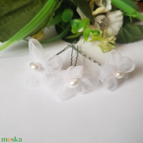 Gyöngyös, fehér tüll virágos hajtű, hajdísz
