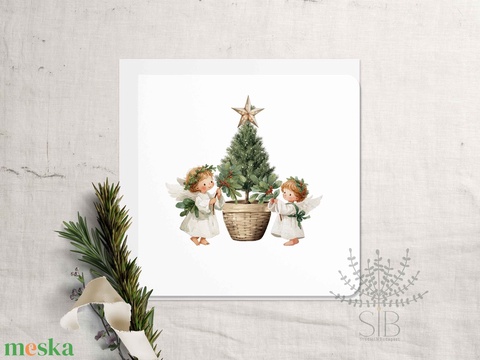 Karácsonyi képeslap, karácsonyfa díszítő angyalok