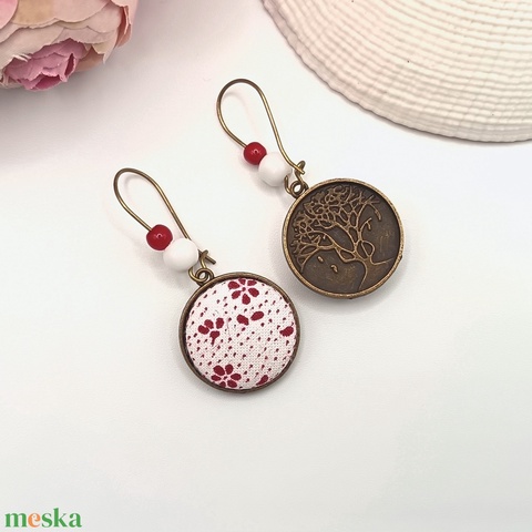 Antik bronz akasztós fülbevaló – fehér, piros virágmintás textil lencsével, fehér achát, piros korallkő ásványgyönggyel
