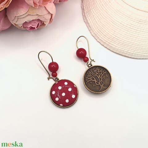 Antik bronz akasztós fülbevaló – piros, fehér pöttyös textil lencsével, piros korallkő ásványgyönggyel