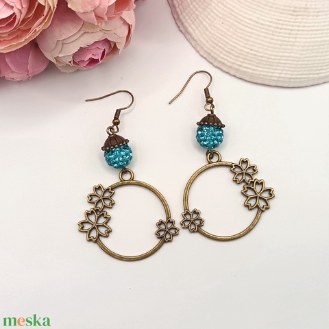Antik bronz akasztós fülbevaló – kék csillogó gyönggyel
