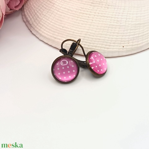 Antik bronz franciakapcsos fülbevaló – rózsaszín, fehér pöttyös lencsével