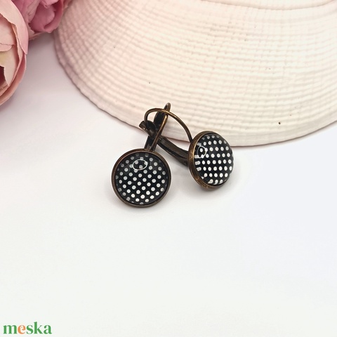 Antik bronz franciakapcsos fülbevaló – fekete, fehér pöttyös lencsével