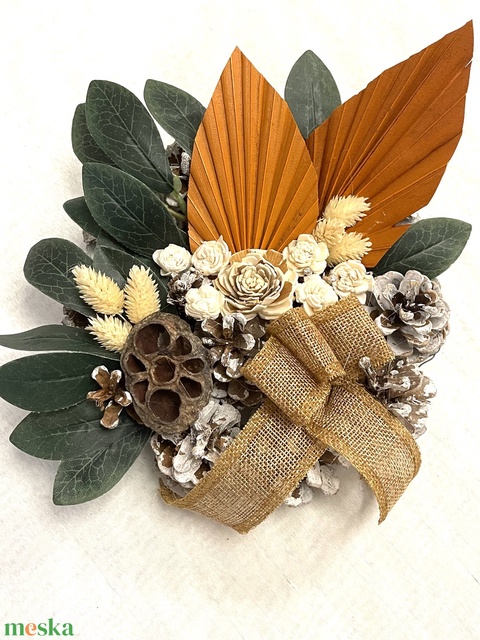 Sírdísz toboz alapon, szárazvirágokkal, termésekkel, szalaggal díszítve