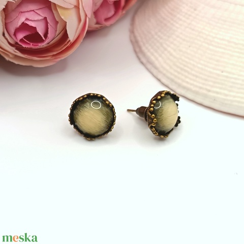 Antik bronz bedugós fülbevaló – füstös krém lencsével