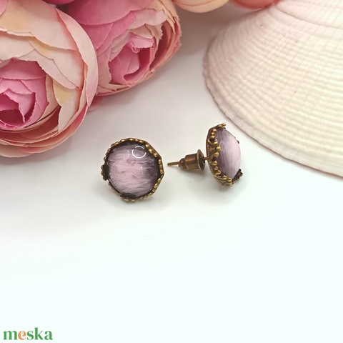 Antik bronz bedugós fülbevaló – füstös rózsaszín lencsével