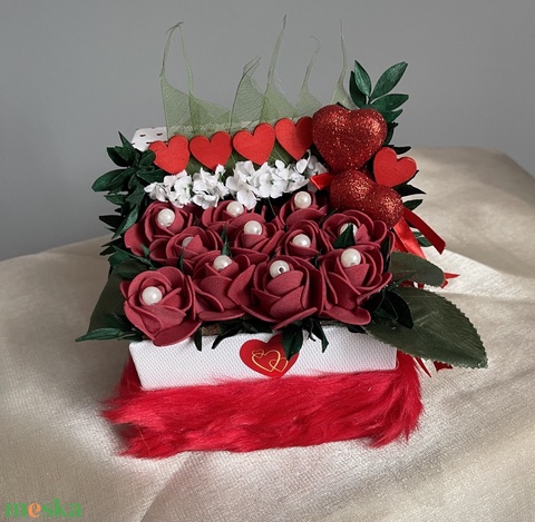 - Anyaga: doboz, polifoam rózsa fej, műzöldek, gyöngyök, szőrme, fa szivecskék
