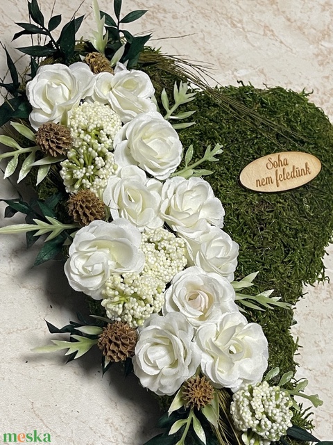 Szív alakú moha alapra készült sírdísz hófehér selyem rózsákkal díszítve