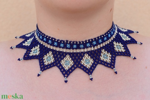 Kék-ezüst ukrán gyöngygallér, gyöngyékszer, ajándék