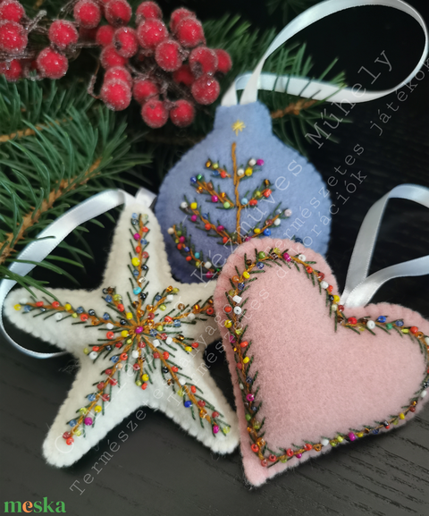 PASZTELL SZÍNŰ HÍMZETT KARÁCSONYI DEKORÁCIÓ 3 DB/SZETT SZÍNES GYÖNGYÖKKEL SZATÉNSZALAG AKASZTÓVAL TERMÉSZETES ANYAGOKBÓL