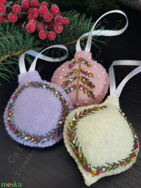 PASZTELL SZÍNŰ HÍMZETT KARÁCSONYI DEKORÁCIÓ 3 DB/SZETT SZÍNES GYÖNGYÖKKEL SZATÉNSZALAG AKASZTÓVAL TERMÉSZETES ANYAGOKBÓL