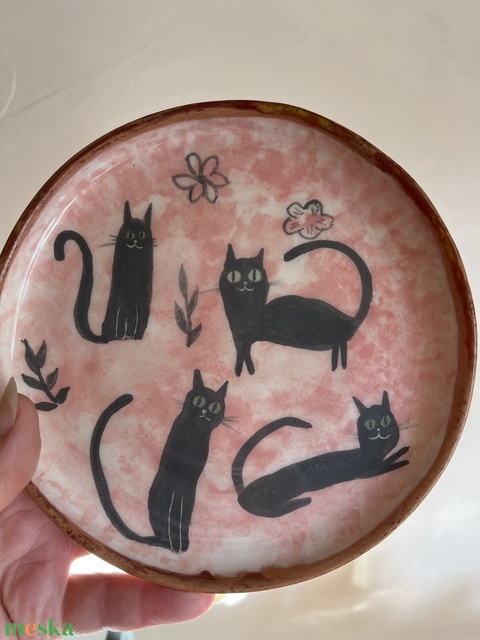 Kézzel készített kerámia desszertes tányér – „Fekete cicák” 16 cm