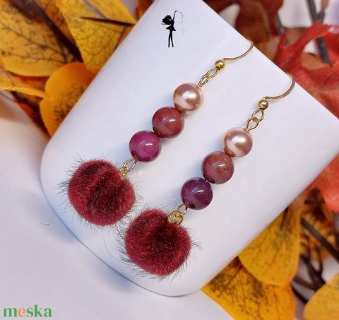 Bordó színü szőrme pomponos ásvány fülbevaló jadéból színátmenettel arany akril gyönggyel