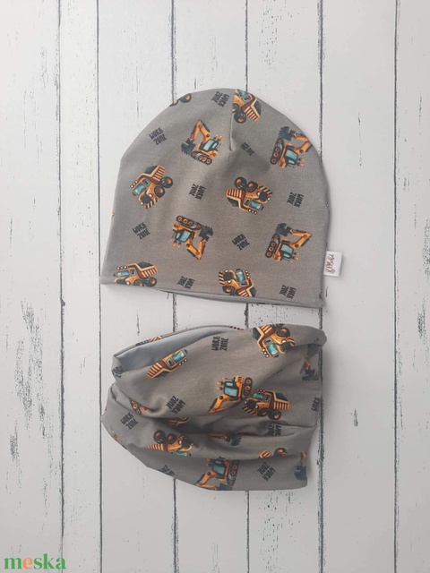 Munkagépek szürke alapon sapka-sál szett (50-52 cm)