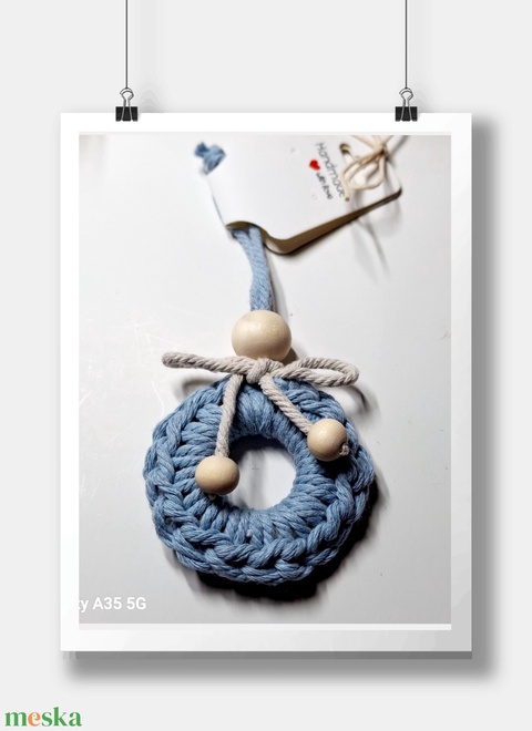 Kékszínű makramé fonalból készült karácsonyi dísz