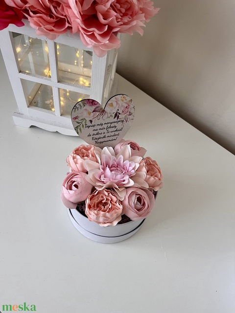Szülőköszöntő, nagymama köszöntő közepes KÖR virágbox - virágoskert - sok féle köszöntő táblával