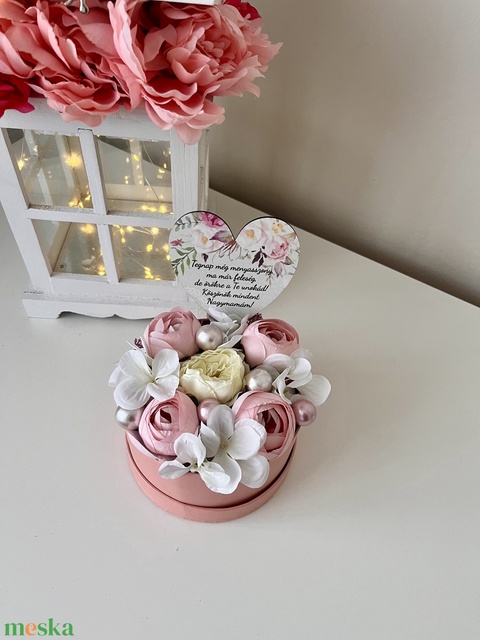 Szülőköszöntő, nagymama köszöntő közepes KÖR virágbox - virágoskert - sok féle köszöntő táblával
