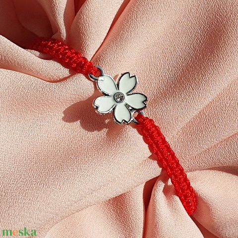 Fonott makramé karkötő, piros, fehér virágos medállal