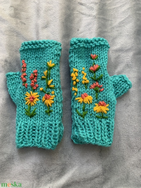 Kézzel kötött kesztyű türkíz színű fonalból készült, kézi kötésű ujjatlan kesztyű hímzett színes virágokkal eladó.