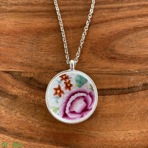 Herendi mentett darabok - porcelán nyaklánc - virágos medál nemesacél lánccal