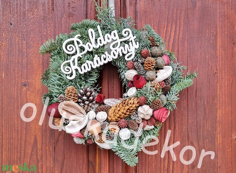 Élő fenyős klasszikus fehér, piros, natúr karácsonyi, ajtódísz, kopogtató, koszorú