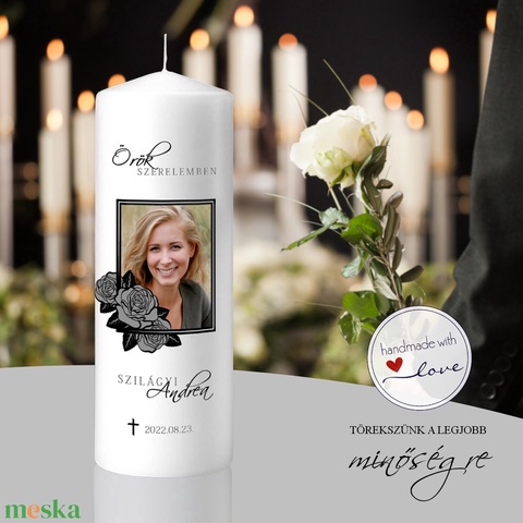 Modern, fiatalos, de egyben elegáns kegyeleti gyertya. Az Örök szerelemben kegyeleti gyertya fő motívuma a rózsás gyász keretben elhelyzett fotó az elhunytról. A kép felett az „Örök szerelemben” felirat olvasható, alatt helyeztük el az elhunyt nevét, alatta pedig az elhalálozás dátumát.