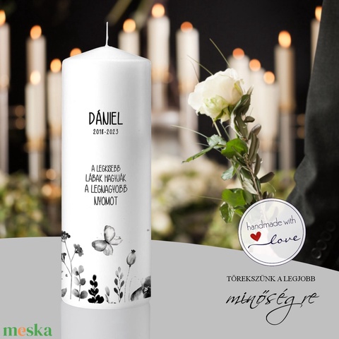 Modern, fiatalos, letisztult kegyeleti gyertya. A Pillangó és virágok kegyeleti gyertya fő motívuma egy, a gyertya alján körbe futó fekete, rajzolt mezei virág sáv egy pillangóval. A gyertya felső részén az elhunyt neve, alatta a daátumok kaptak helyet. A virágok és a név között egy idézetet helyeztünk el.