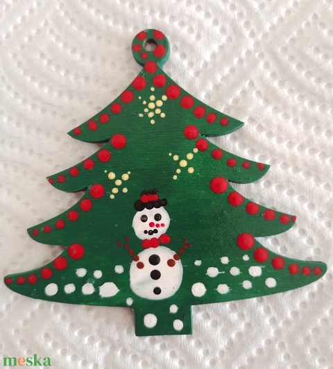 Karácsonyfadísz pontozott technikával, hóember mintával - fenyőfa