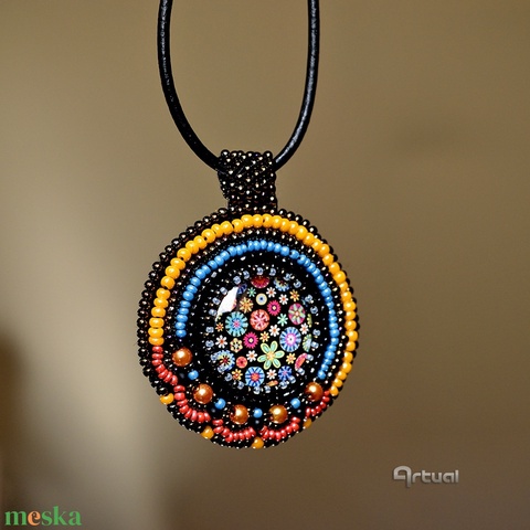 Színes gyöngyhímzett medál virágos üvegkabosonnal