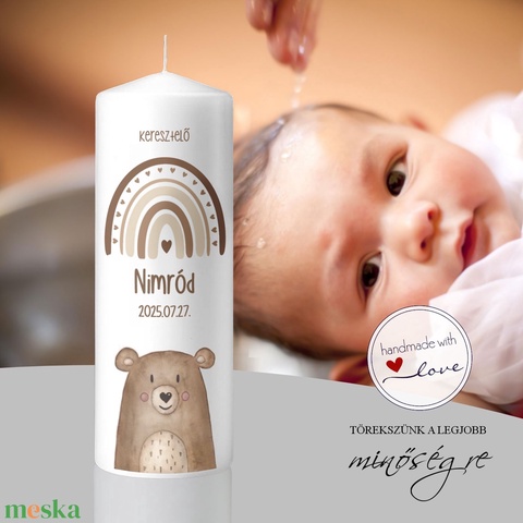 A Maciölelés keresztelő gyertya vidám és szeretetteljes hangulatot áraszt, tökéletes választás kisfiúk számára. A barna árnyalatú szivárvány, közepén egy apró szívvel, az isteni gondviselés és az új kezdet szimbóluma. Az alsó részen egy kedves, mosolygós mackó teszi még bájosabbá a gyertyát, amely a gyermek ártatlanságát és védelmét jelképezi. A gyertya középen a gyermek nevével és keresztelőjének dátumával válik személyessé és emlékezetessé. Egyedi kézműves darab, amely méltó kísérője a keresztelő ünnepségnek, és maradandó emlék a család számára.