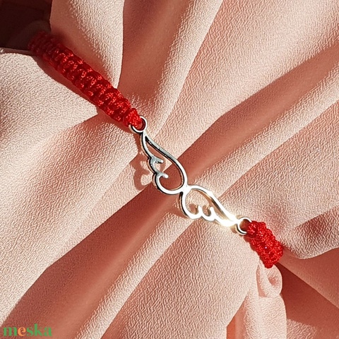 Fonott makramé karkötő, piros, ezüst színű angyalszárny medállal
