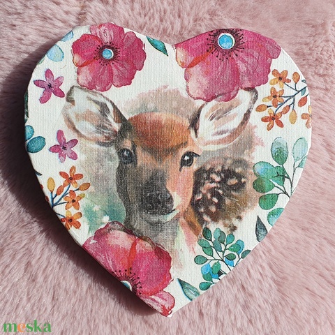 Szív alakú virágos, őzikés kép - decoupage technikával