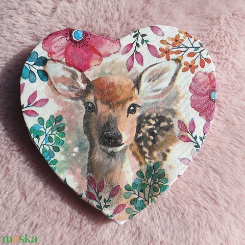 Szív alakú virágos, őzikés kép - decoupage technikával