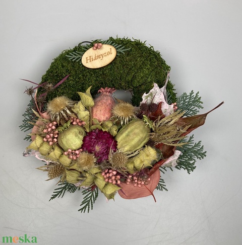 Tisztelet - Száraz és szárított növényi részekkel gazdagon díszített, fatáblácskás mohakoszorú (KK-30)