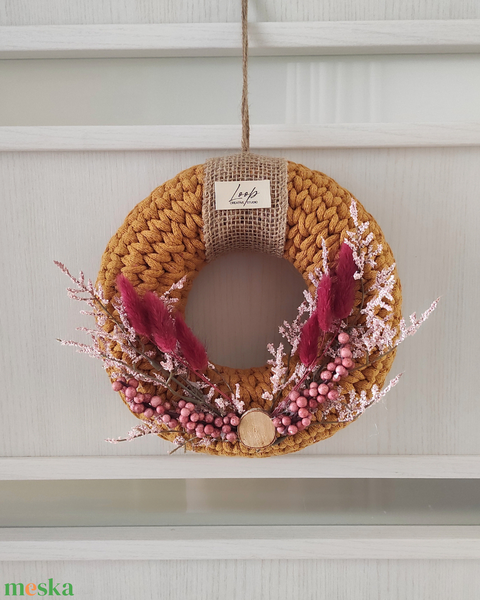 Őszi ajtódísz kézzel horgolt alapon okker sárga- bordó kombinációban